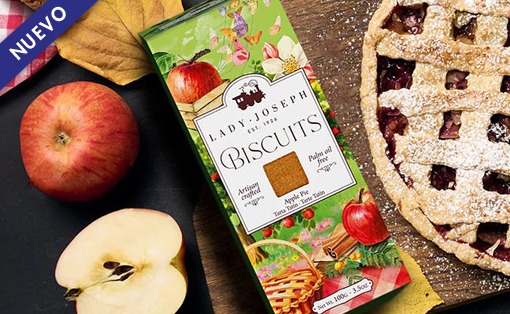 - Galletas de manzana y canela Lady Joseph, elaboradas de forma artesanal con todo el mimo y cuidado. Su textura es delicadamente crujiente y su sabor recuerda a los bizcochos de siempre, con un toque especiado que reconforta y que transporta al corazón de la repostería casera.