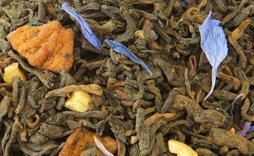Es un Té Pu Erh de sabor muy característico a almendra amarga que contiene además, peladura de naranja, trocitos de manzana, flores de aciano, canela y clavo.