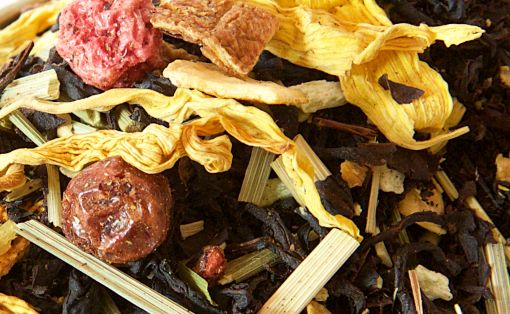 Con sabor a piña y limón. Es una mezcla de Tés negros de Ceylán y China con trocitos de jengibre, peladuras de naranja, limoncillo, trocitos de manzana, ralladura de coco, trocitos de piña, arándanos rojos, cardamomo y flores de girasol.